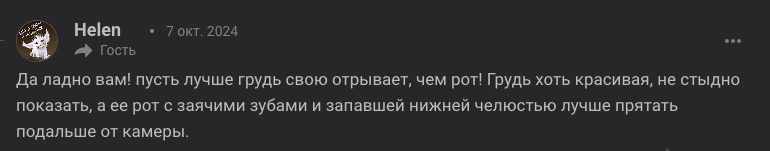 Ну а этот ваш комментарий об актрисе, талантом и внешностью которой очень многие восхищаются во всем мире, под какой пункт подпадает? Биполяркой не назову, т.к. здесь лицемерие на лицо. Долго не могла понять, почему вас гнобят на этом сайте, пока случайно не наткнулась на это. Видать вам не в первой проходиться по актерам, не соответствующим вашему "эстетическому" вкусу...
